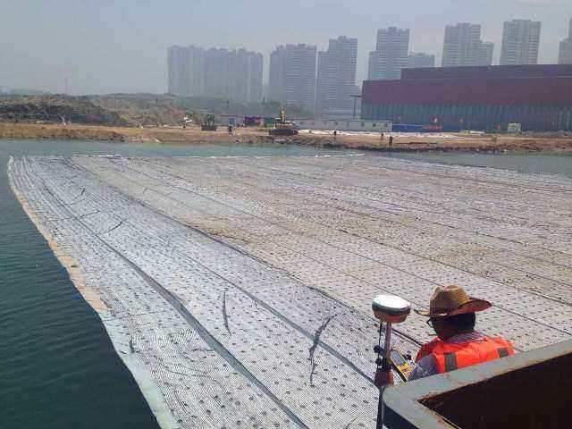 根據防波堤每個斷面排體尺寸裁剪土工布的尺寸,結合加筋帶以及砂肋套的布置情況,進行縱、橫丈量劃線,保證加筋帶以及砂肋套綁扎環(huán)位置的準確性。