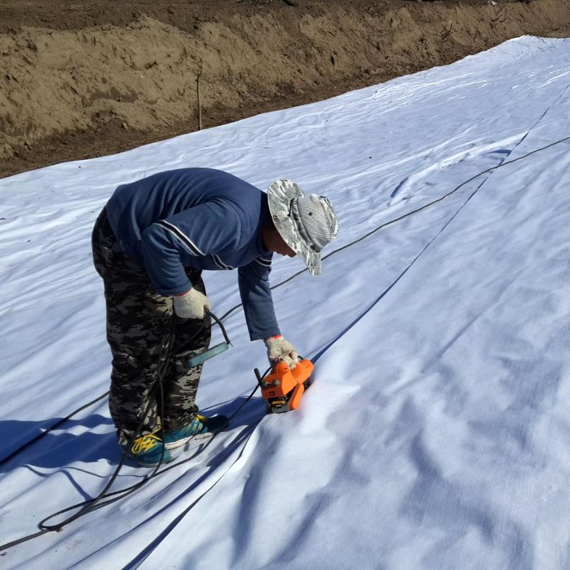 下料前檢查復(fù)合土工的外觀質(zhì)量,記錄并且修補(bǔ)已發(fā)現(xiàn)的生產(chǎn)創(chuàng)傷、孔洞、折損,土工施工前應(yīng)進(jìn)行現(xiàn)場(chǎng)鋪設(shè)試驗(yàn),根據(jù)現(xiàn)場(chǎng)數(shù)據(jù)確定焊接溫度、速度等施工工藝參數(shù)以供水庫(kù)使用。